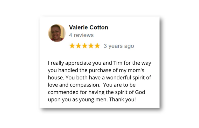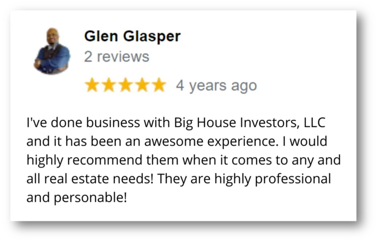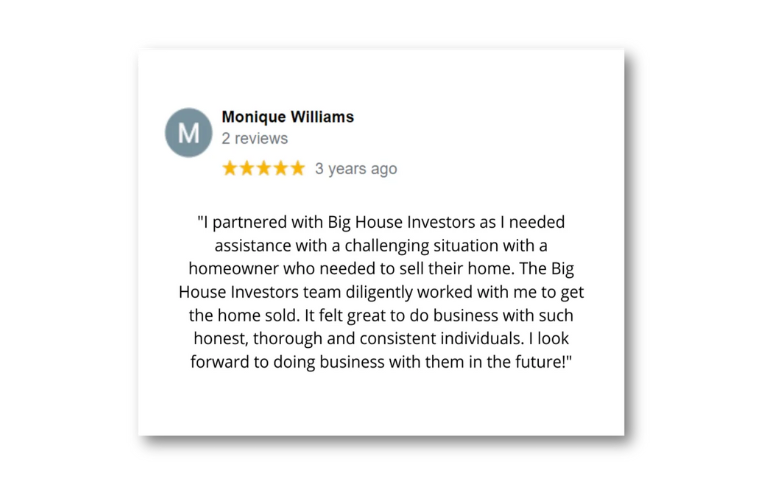 “My experience with Big House Investors has been wonderful. They were very patient and caring and kind with me. Fran is an awesome asset to the company…she handles everything promptly.”